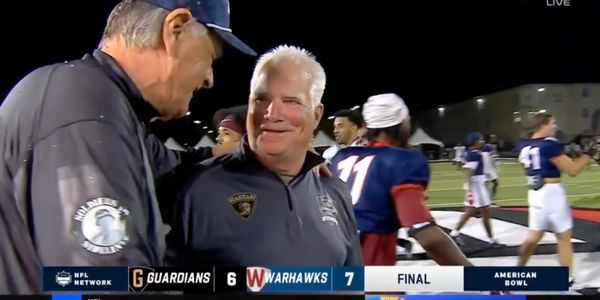 Head Coaches Brian Billick (Warhawks, Left) and Mike Smith (Guardians, Right) embrace after the last second victory in the Inaugural American Bowl.
